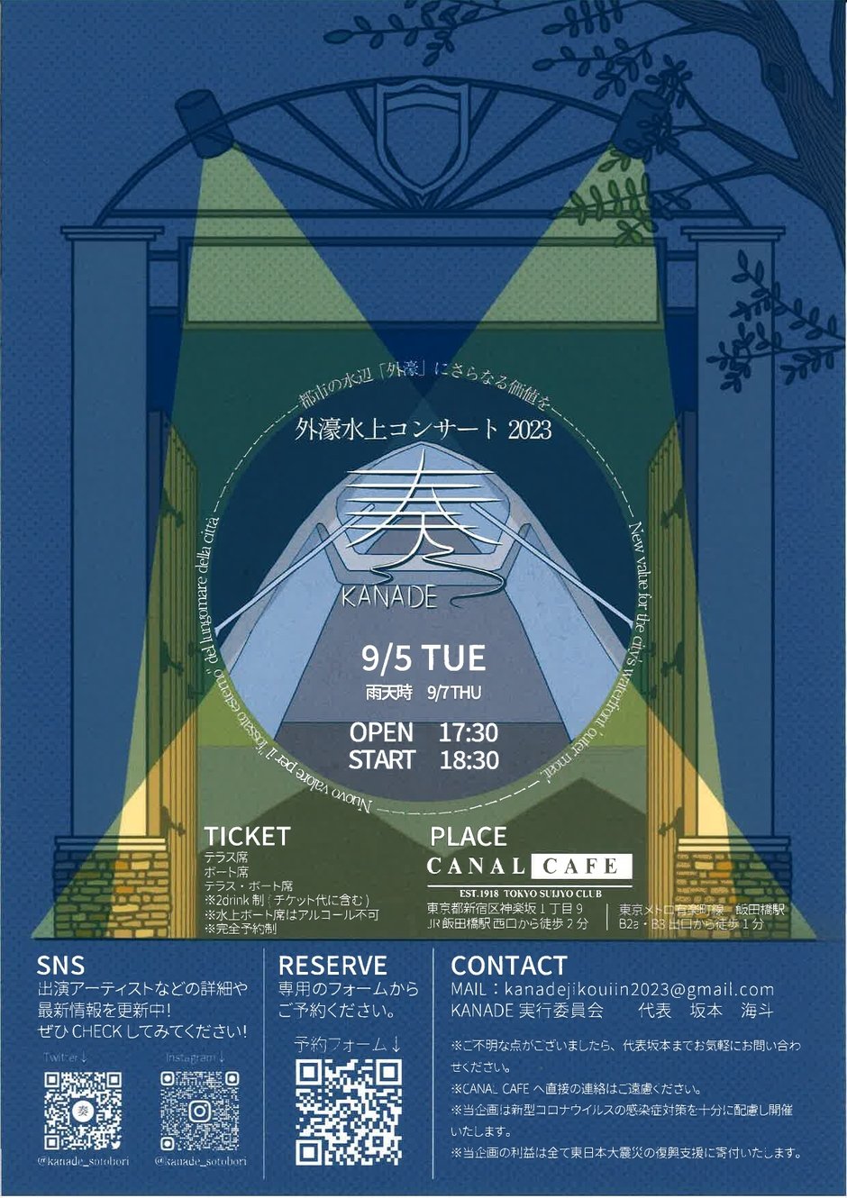 | Contact | 奏実行委員会 代表 坂本海斗 (東京理科大学大学院修士課程) kanadejikouiin2023@gmail.com (CANAL CAFEへ直接の連絡はご遠慮ください) |
