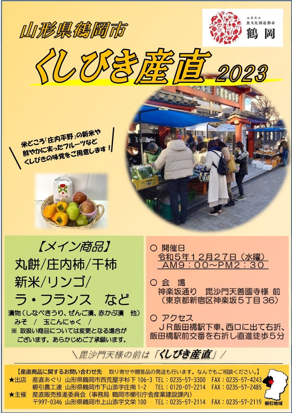 | Contact | <主催> 産直販売推進委員会(事務局:山形県鶴岡市櫛引庁舎内) 〒997-0346 山形県鶴岡市上山添字文栄100 TEL0235-57-2114/FAX0235-57-2117 鶴岡市サイトhttp://www.city.tsuruoka.lg.jp/ |