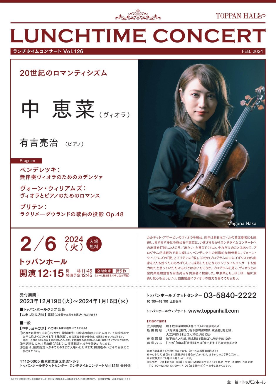 〈ランチタイムコンサート Vol.126〉中 恵菜(ヴィオラ)【入場無料/受付中】