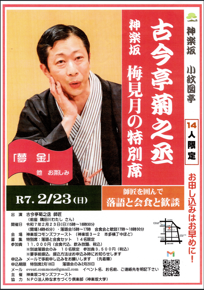 特別席:第一部・第二部セット(落語と師匠を囲んでの会食セット) 定員14名 参加費11,000円(会食代込・飲み放題・消費税込) ※別途第一部のみ(落語会のみ)もご用意しています。 但し定員10名 参加費 3500円(消費税込み) *全て要事前申込み・要事前振込。振込方法・振込口座・振込期限は申し込み時にお知らせします。 *振込後のキャンセルは出来ませんのでご承知おきください。振込手数料はご負担ください。 |