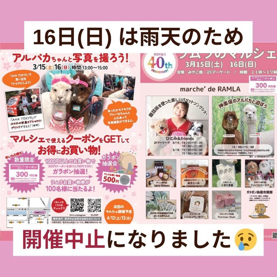🌧️ 3月16日(日)のラムラマルシェは、雨天のため開催中止となります。楽しみにしていただいた皆さま、申し訳ありませんがご了承ください。