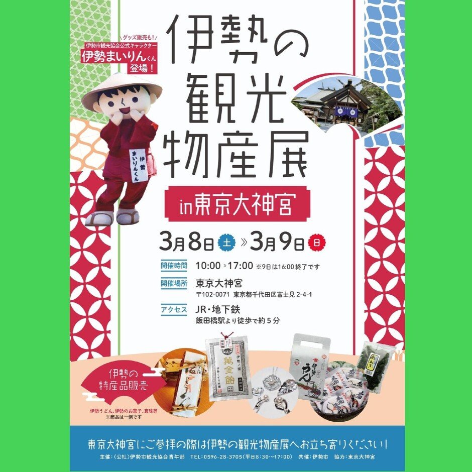 3月8日(土)・9日(日)の2日間、境内で伊勢の特産品の販売を行います。伊勢市観光協会公式キャラクターの「伊勢まいりんくん」も登場しますよ。