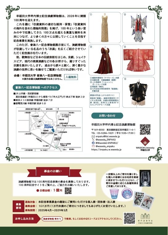 2028年に開館100周年を迎える、早稲田大学坪内博士記念演劇博物館。この節目を機に、演劇博物館では100万点を超える収蔵資料の「適切な保存」と「国内外への発信強化」を柱とした記念事業を展開します。その一環として、會津八一記念博物館展示室にて、特別展示「舞台衣裳展」が開催されます。