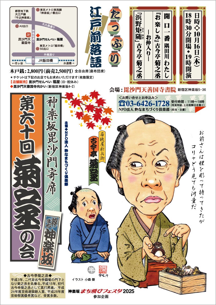 | Location | 神楽坂 毘沙門天 善国寺書院 (神楽坂5-36) JR飯田橋駅、西口 徒歩10分 有楽町線飯田橋駅 B3出口 徒歩5分 東西線神楽坂駅(神楽坂口) 徒歩7分 大江戸線牛込神楽坂駅 A3出口 徒歩6分 |