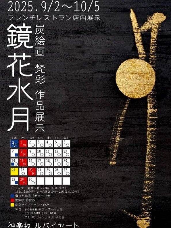 会場のカジュアルフレンチレストラン「神楽坂ルバイヤート」は、美しい一皿とともにアートを堪能できる空間です。山梨の食材を使った香り立つ料理やワインを味わいながら作品と向き合うことで、心が自然と開かれ、炭絵画の静謐な世界がより深く胸に響きます。