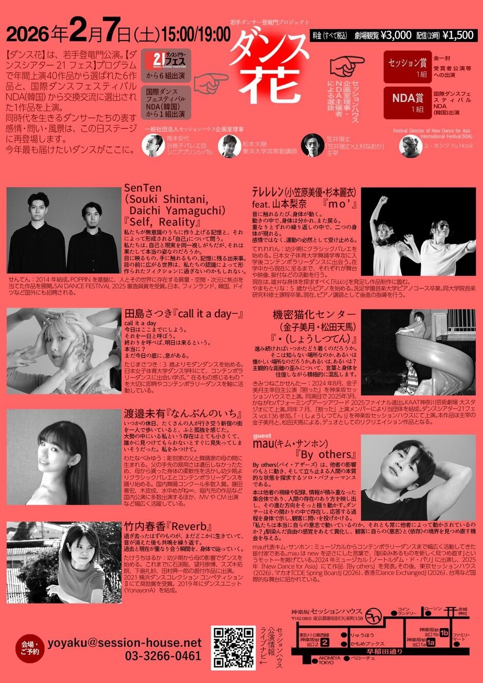【ダンス花】は、若手登竜門公演。【ダンスシアター21フェス】プログラムで年間上演40作品から選ばれた6作品と、国際ダンスフェスティバルNDA(韓国)から交換交流に選出された1作品を上演。