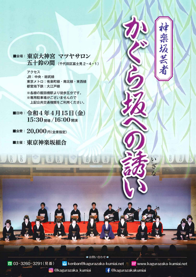 | Contact | 東京神楽坂組合 お問い合わせ:☎03-3260-3291(見番) メール:kenban@kagurazaka-kumiai.net |