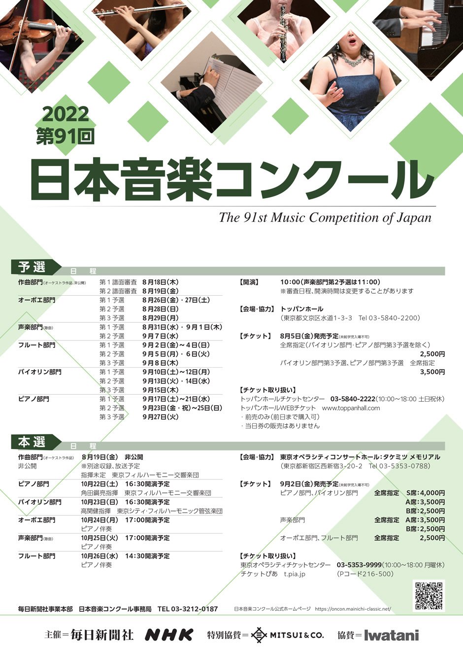 | Contact | [チケットのお申し込み] トッパンホールチケットセンター 03-5840-2222(平日10:00~18:00) [日本音楽コンクールに関するお問い合わせ] 毎日新聞社事業本部内 日本音楽コンクール事務局 03-3212-0187(平日10:00~18:00) |