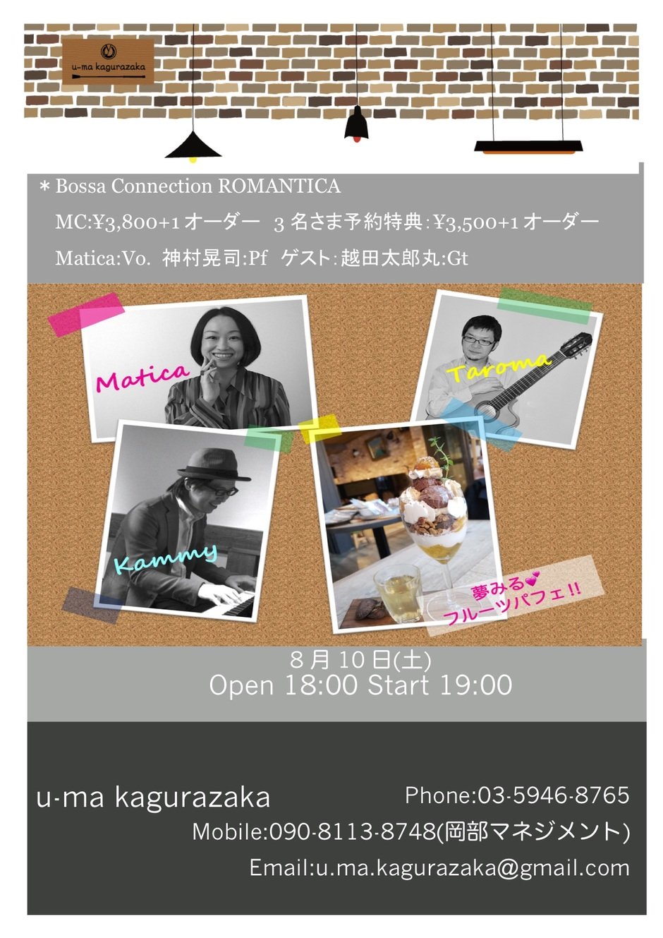 | Participation Fee | MC:¥3,800 トリオ割引:¥3,500 + 1ドリンク (u-maベジプレート:¥1,000 Jonaさんのパフェ:¥1,200 完全予約制) |