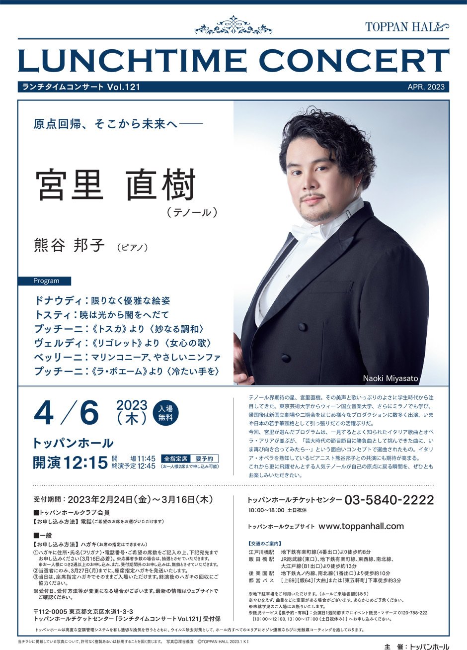〈ランチタイムコンサート Vol.121〉宮里直樹(テノール)【入場無料/事前受付終了】