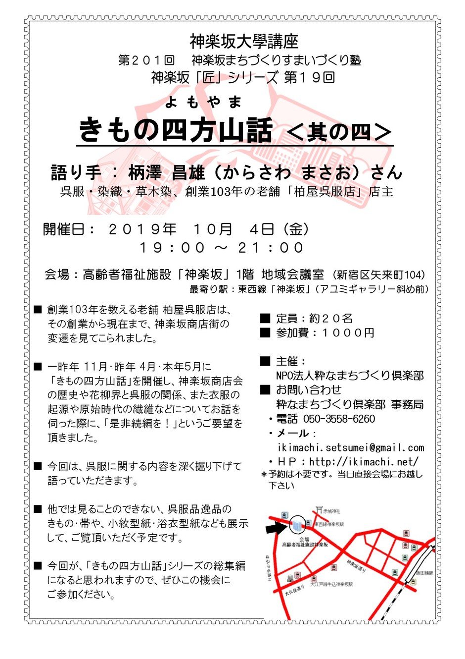 | Location | 高齢者福祉施設「神楽坂」1階 地域会議室 (新宿区矢来町104) 最寄り駅:東西線「神楽坂」(アユミギャラリー斜め前) |