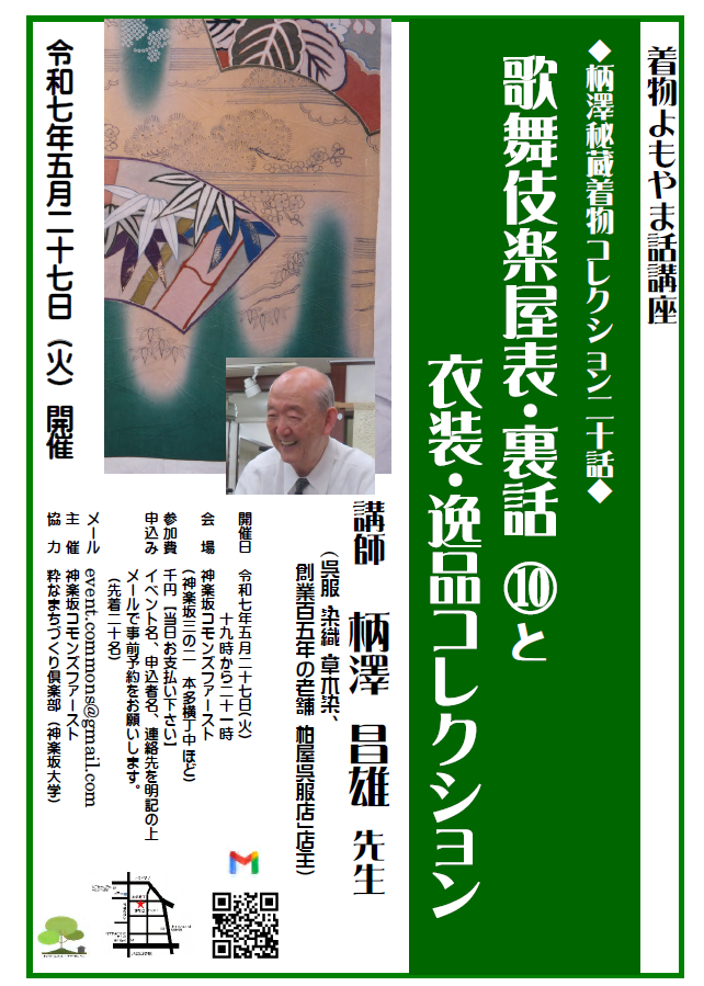 神楽坂コモンズファースト主催・粋なまちづくり倶楽部協力の、着物・染め物よもやま話「柄澤昌雄コレクション第20話」のお誘いです。