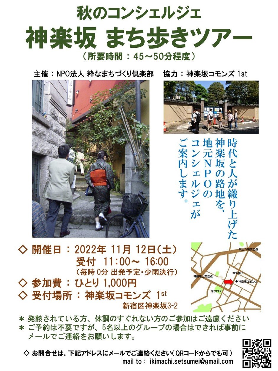 | Location | 受付場所:神楽坂コモンズ1st (新宿区神楽坂3-2) まち歩き:神楽坂の見所各所 |