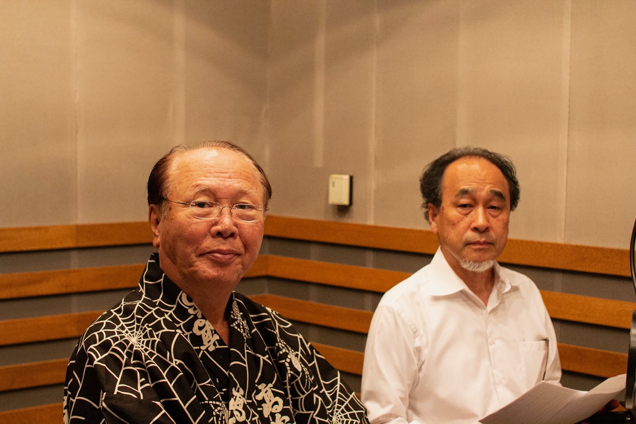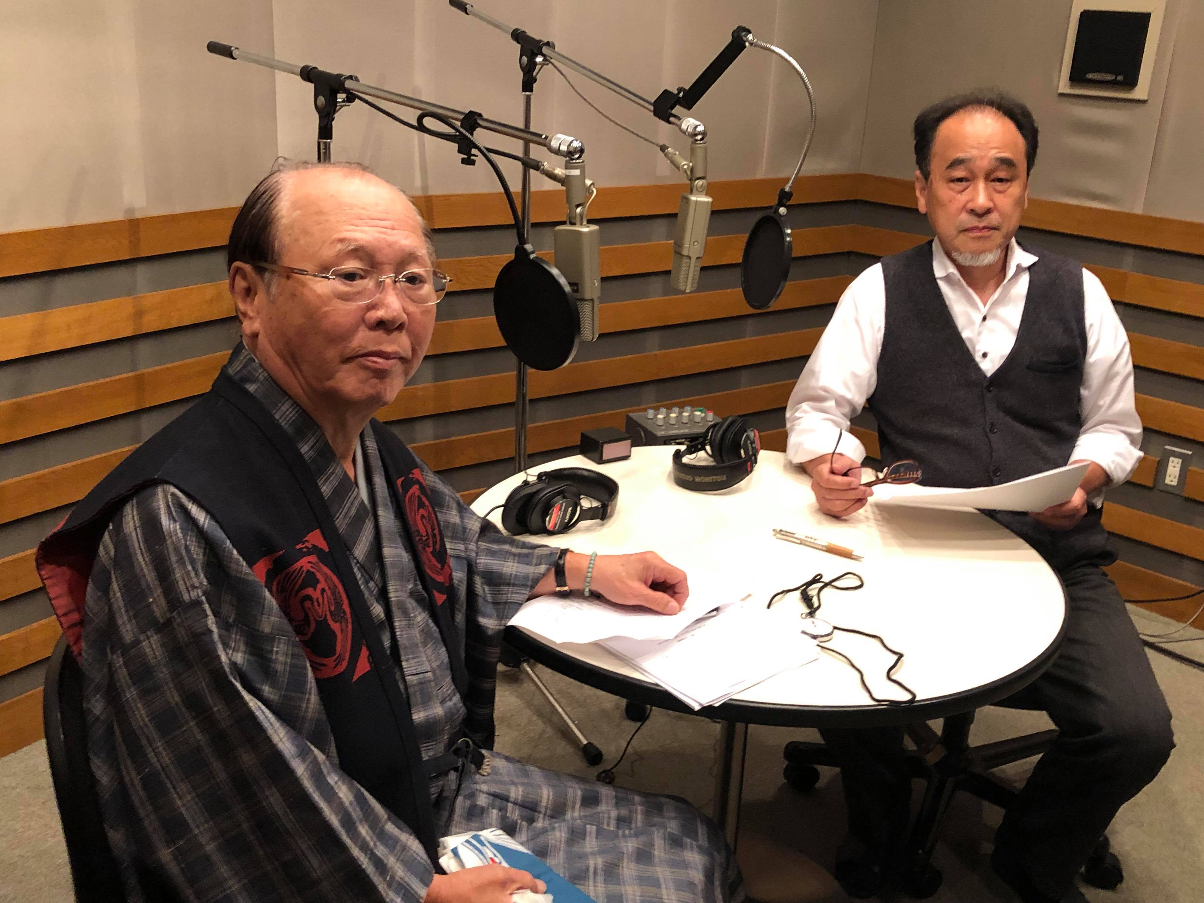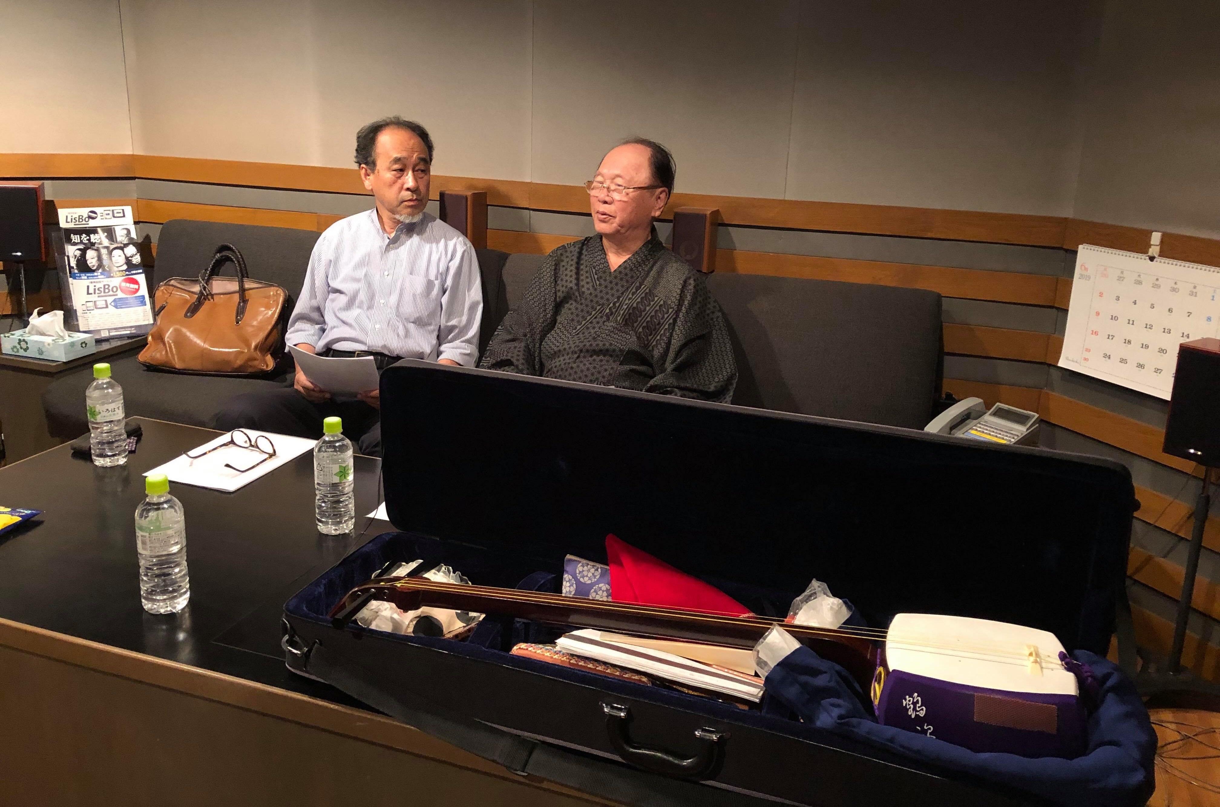 収録の合間の鶴賀若狭掾師匠(右)と、聞き手の長岡弘志(左)