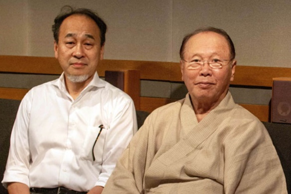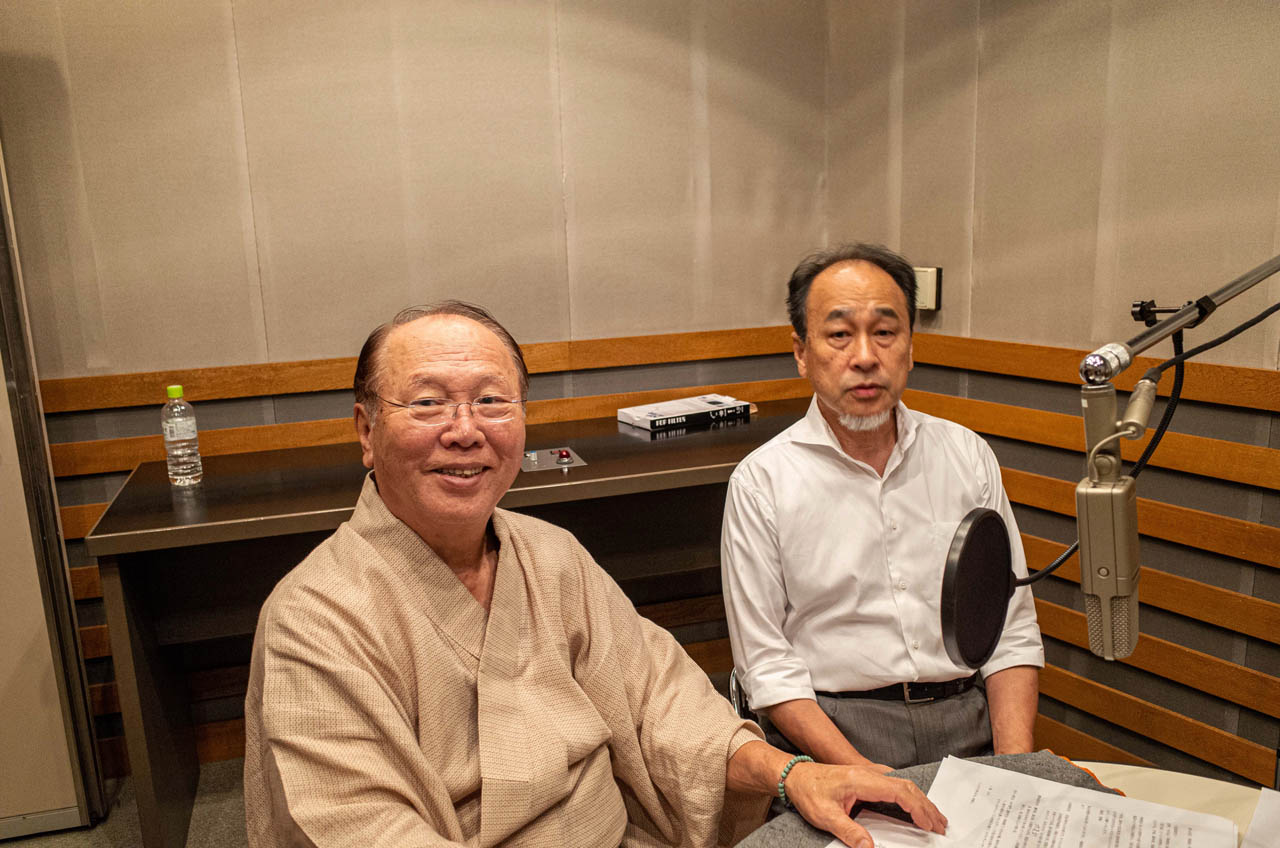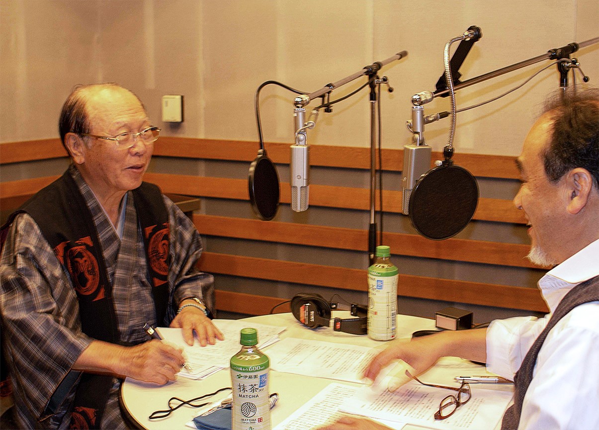 収録の合間の鶴賀若狭掾師匠(左)と、聞き手の長岡弘志(右)