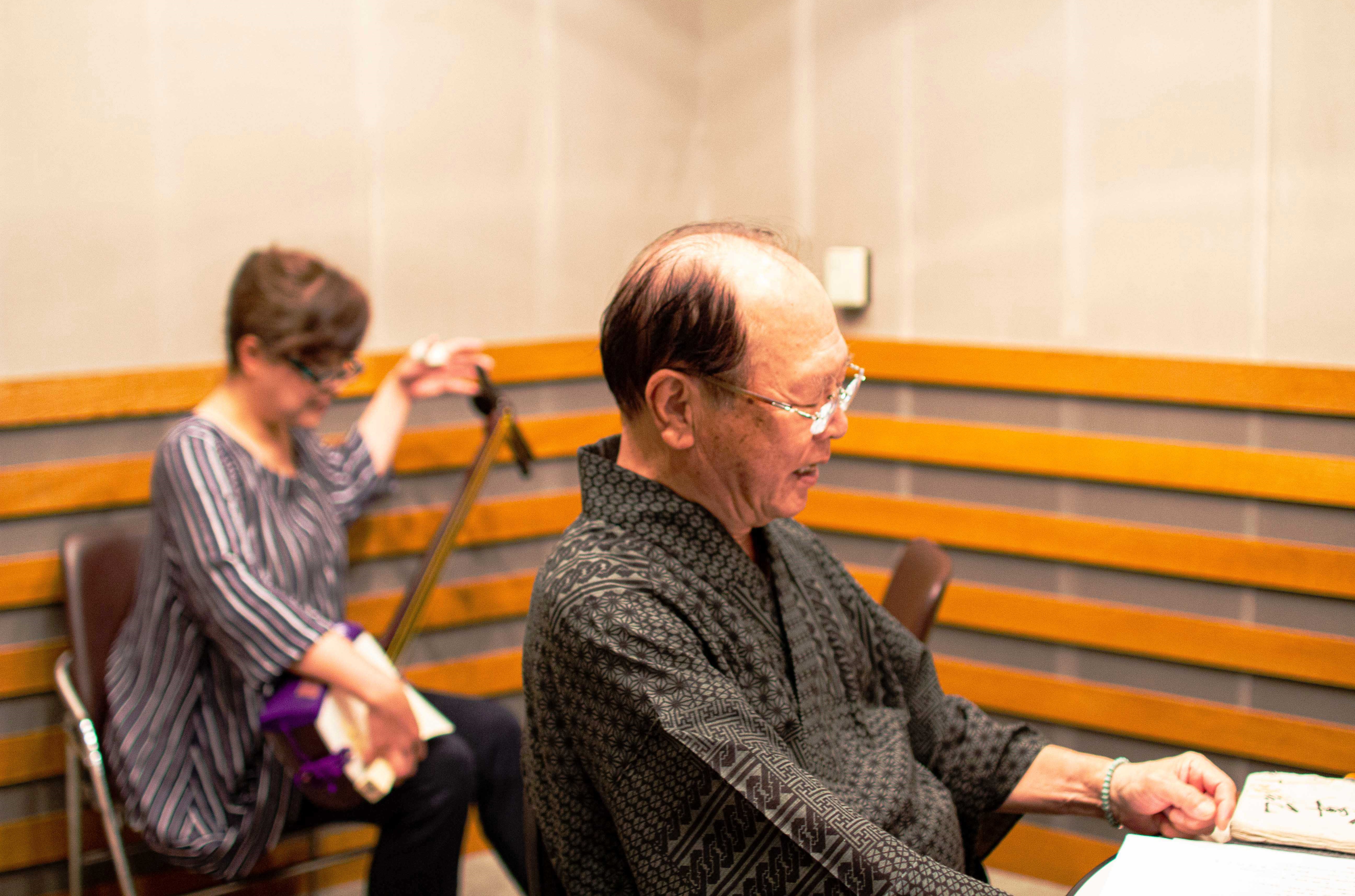 収録風景 鶴賀若狭掾師匠(右)、鶴賀伊勢吉(左)